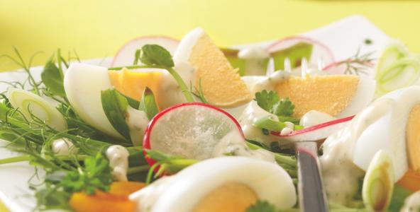 Zubereitung Zubereitungszeit: 20 Min. Radieschen waschen und in Scheiben schneiden. Eier pellen und vierteln. Paprika waschen, in Würfel schneiden und in erhitztem Öl ca. zwei Minuten braten. Mit zwei Esslöffeln Sojasauce ablöschen. Frühlingszwiebeln putzen, waschen und schräg in Ringe schneiden. Sprossen evtl. waschen. Für das Dressing Kräuter, Mayonnaise, Essig und restliche Sojasauce verrühren und mit Pfeffer und Zucker würzen. Dressing mit den Salatzutaten vermischen, nach Wunsch auf Salatblättern anrichten und mit knusprigem Baguette servieren. |